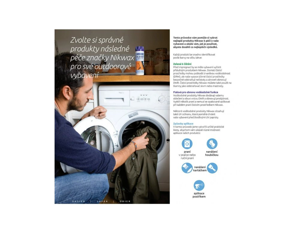 Prodyšné voděodolné vybavení je vždy dodáváno s již naneseným trvale voděvzdorným (DWR) potahem, který brání nasávání vody do materiálu. Úprava DWR se znehodnocuje špínou či praním za použití běžných pracích prostředků. Špína přitahuje vodu a domácí prací prostředky zanechávají hydrofilní zbytky, což vede k tomu, že oděv v mokrém či vlhkém prostředí nepropouští vlhkost ven. Čisticí přípravky Nikwax účinně čistí voděvzdorné tkaniny a obnovují úpravu DWR tím, že odstraňují hydrofilní špínu a zbytky pracích prostředků.