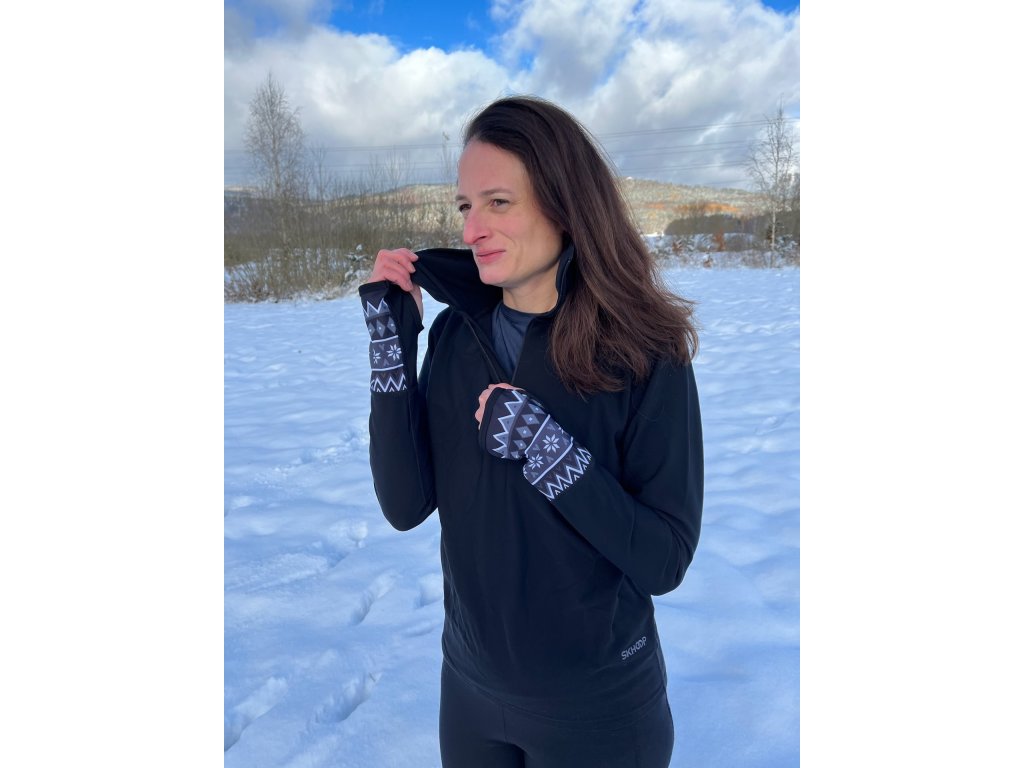Příjemná mikinka se stojáčkem na zip a elegantním severským potiskem na rukávech. Rukávy mají na konci díry pro palec. Vyrobena je z hřejivého italského materiálu Vuelta s jemným chloupkem na vnitřní straně.