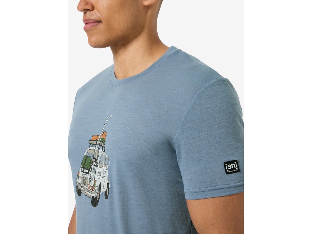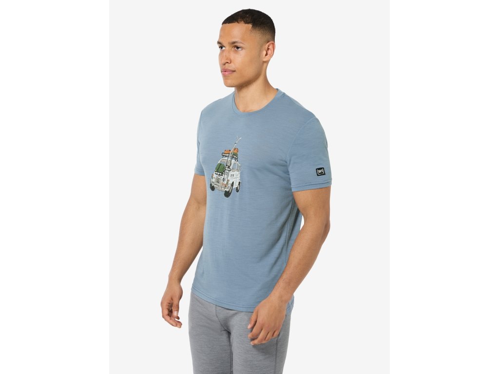 Pohodlné světle modré merino triko s krátkým rukávem a potiskem fiatkem na lyže. Tak naskočte na tu správnou vlnu s merino trikem s krátkým rukávem Carski Tee a užijte si pořádné dobrodružství v merino vlně, která je tak příjemná na dotek, je prodyšná a odolná vůči zápachu. Triko můžete nosit po celý rok a na jakékoliv dobrodružství.