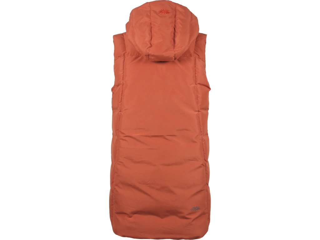 Teploučká oranžová péřová vesta pro podzim až jaro. Je příjemně naducaná a opravdu vám v ní nebude zima. Délka je pod zadek, takže záda jsou krásně krytá před chladem.